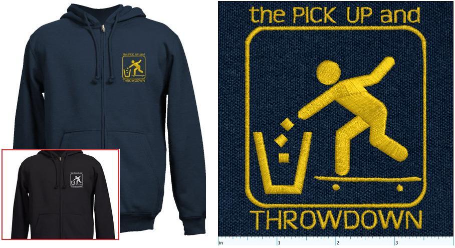 This is the perfect zip-up to wear when you're beautifying your local skatespot. Cotton blend and preshrunk for comfort, this is the official hoody of giving back to our community!! P.U.T.D. logo is stitched 4x4" on left-hand breast. Hoody zips up, and has two hand pockets; available in gold on navy, or black with white stitching.